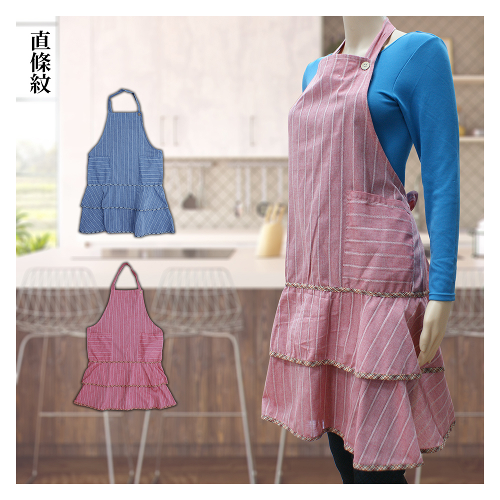 日式蛋糕裙風頸帶兩段調節側雙口袋圍裙-直條紋