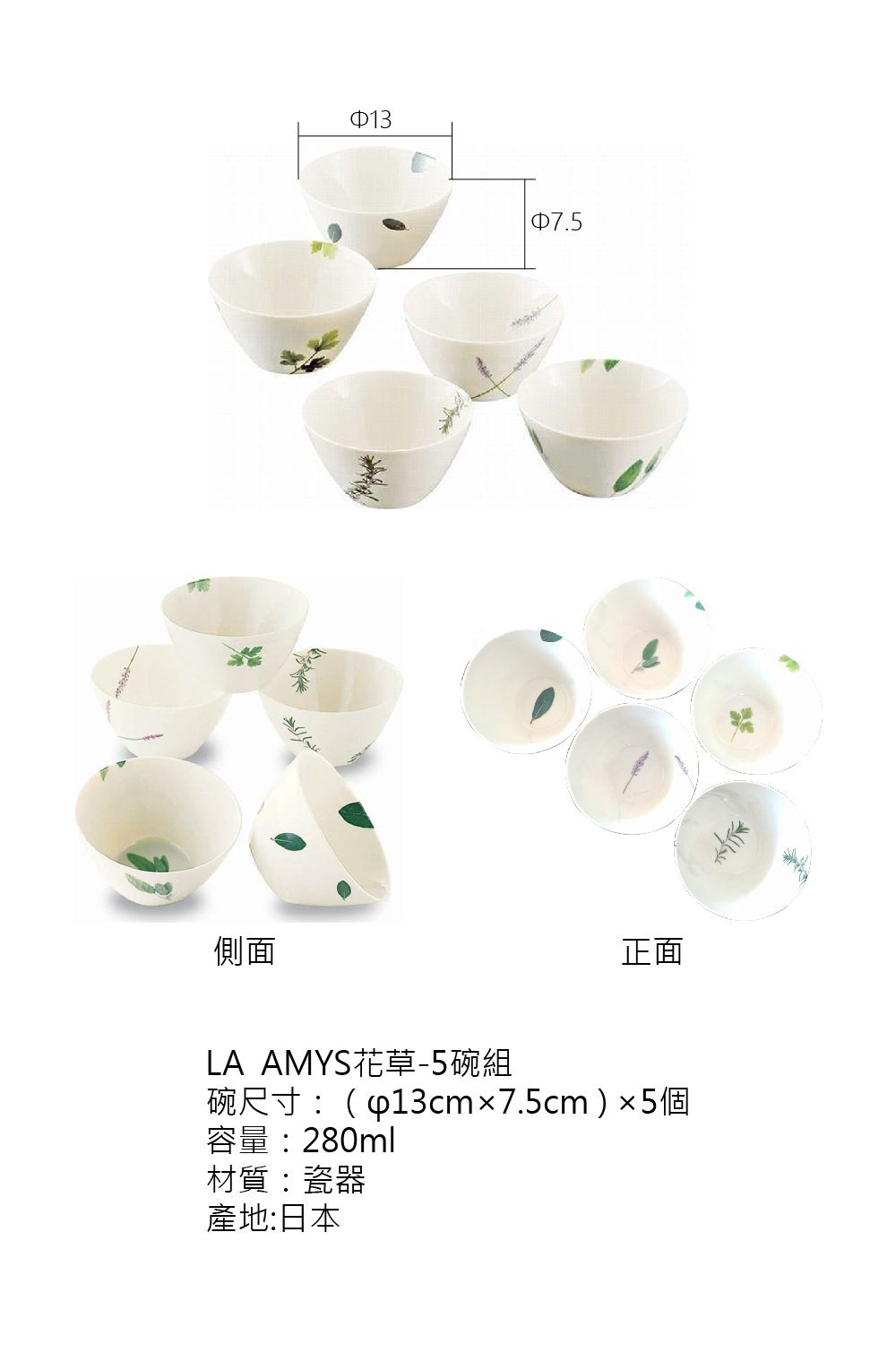 碗尺寸:(φ13cm×7.5cm ) ×5個