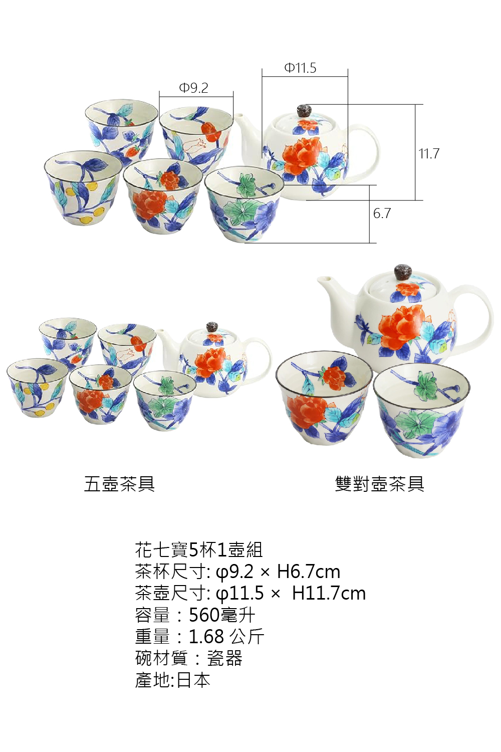 陶瓷藍花七寶5杯1壺組