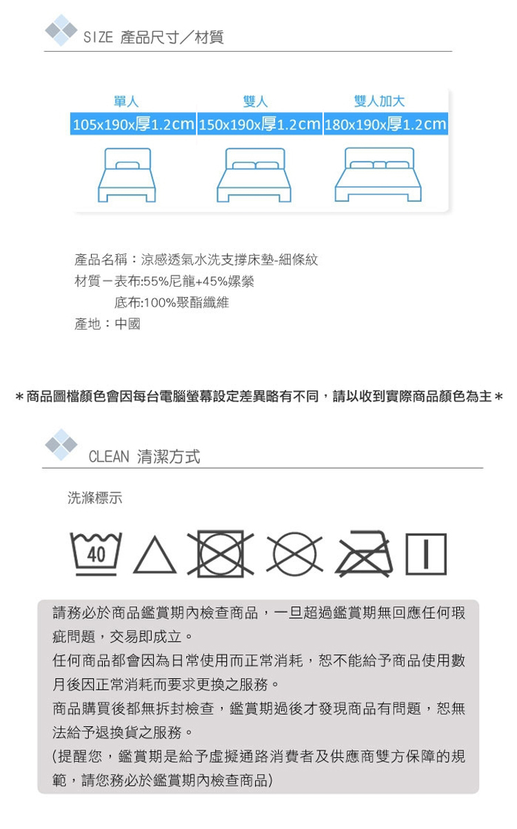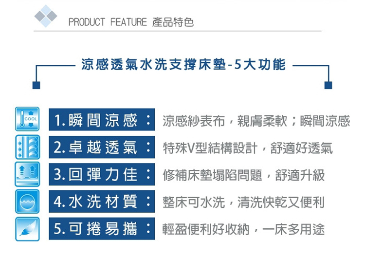 涼感透氣水洗支撐床墊-5大功能