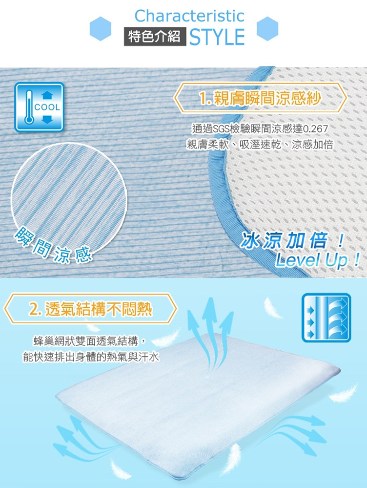 1.瞬間涼感 : 涼感紗表布,親膚柔軟;瞬間涼感