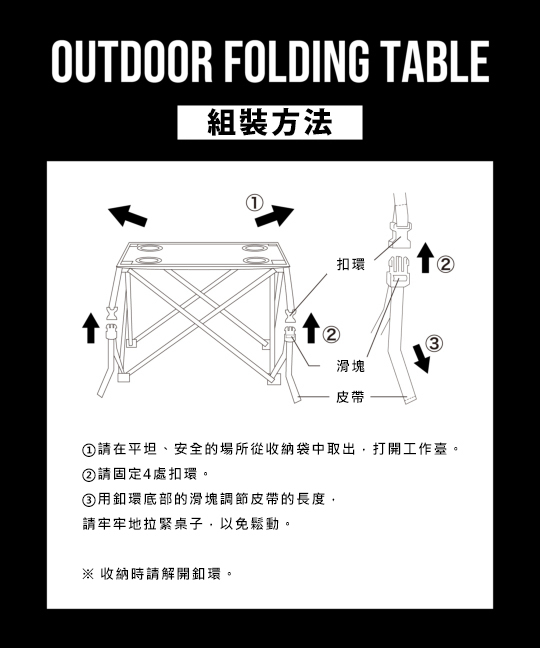 可拉動從四個扣環側面出來的皮帶來調節張力。